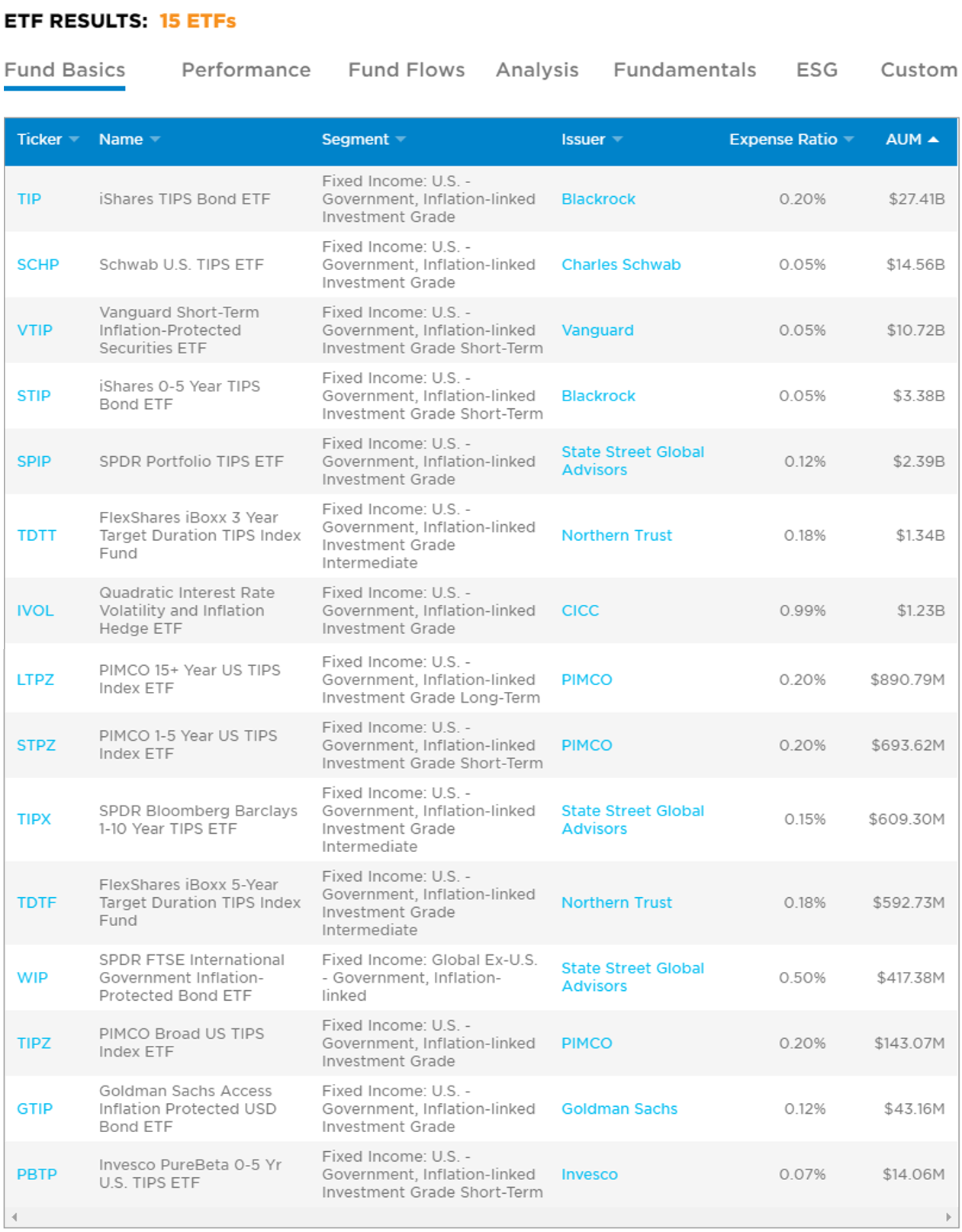 미국에 상장된 TIPS 관련 ETF는 총 15개 입니다. 대표적인 것은 블랙록에서 운용하는 iShares TIPS Bond ETF입니다. 자산운용규모만 해도 270억 달러가 넘고, 하루 평균 거래금액은 2억 9천만 달러를 넘어서 TIPS ETF 중 거래도 가장 활발합니다. 반면 운용보수는 0.20%로 타 TIPS 관련 ETF 대비 다소 높은 편이고, 일반 채권 ETF와 비교해서도 상위권에 위치한다고 할 수 있습니다.