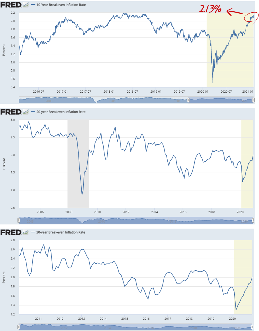 최근 기대인플레이션의 상승곡선은 10년물, 20년물, 30년물 모두 동일한 모습을 보이고 있고, 모두 가파르게 상승하는 것을 확인할 수 있습니다. 맨 위 10년물 BEI 차트를 보면 최근 BEI는 2.13%입니다. 이는 시장에서 향후 10년 간 소비자물가상승률이 2.13% 정도 예상된다는 것을 의미합니다.