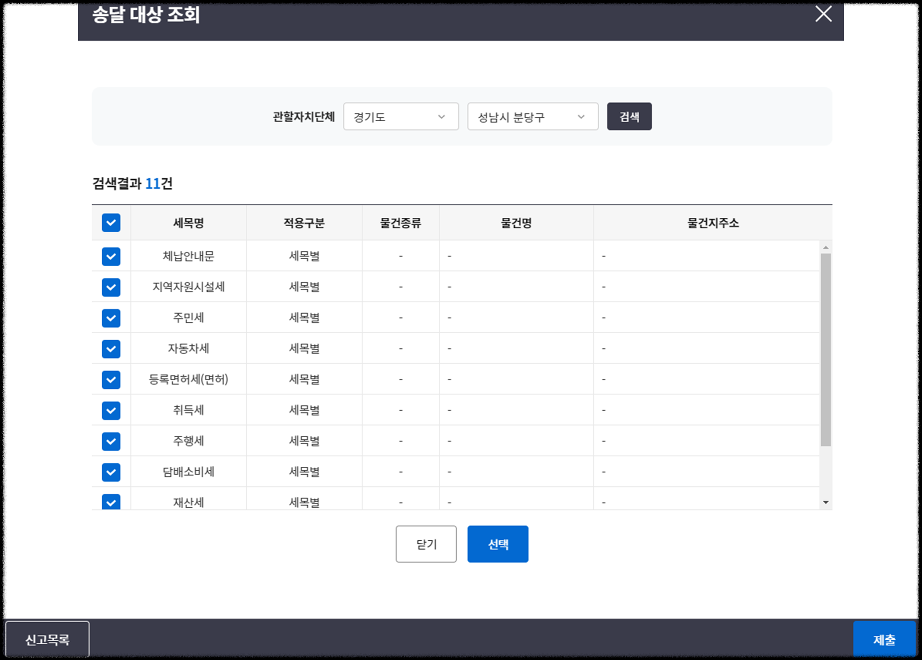 먼저 송달장소 신고를 클릭한 후 관할자치단체에서 송달 가능한 목록을 확인합니다. 목록 확인 후 전체 체크하고, 선택 버튼을 클릭하면 해당 내용이 반영됩니다.