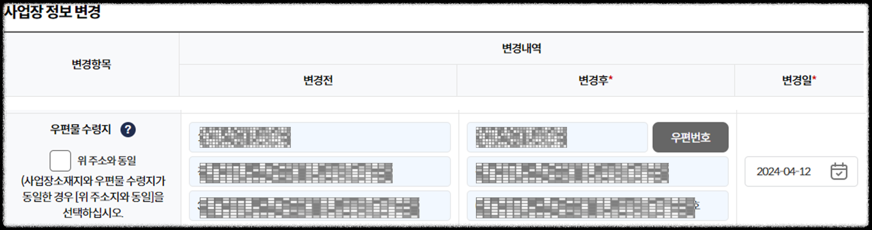 그리고 사업장 정보 변경에서 "우편물 수령지" 정보를 변경해 줍니다.