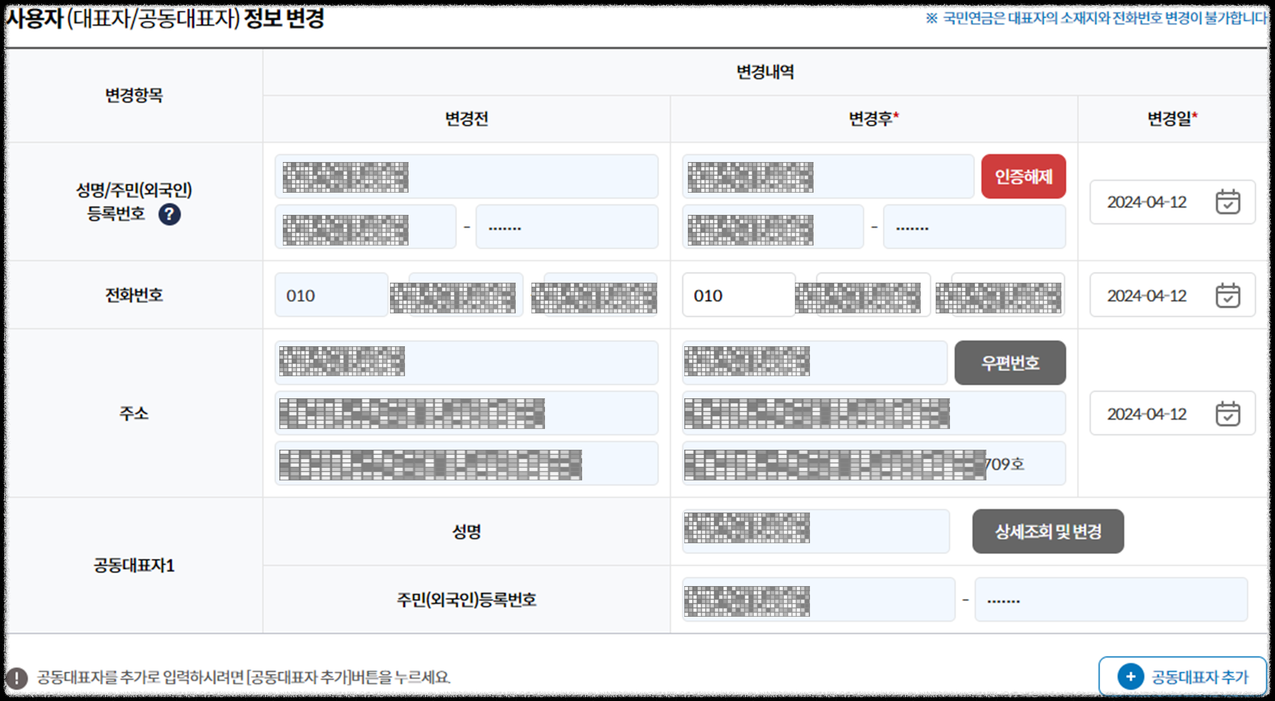 먼저 대표자의 정보가 변경된 내용이 있다면 "변경 후" 내용을 작성해 줍니다.