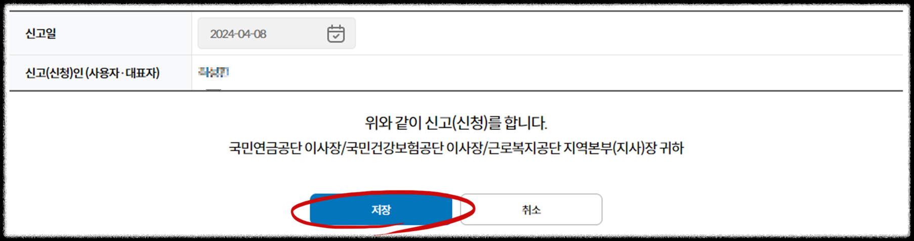 마지막으로 신고일 날짜를 확인하고 "저장" 버튼을 클릭합니다.