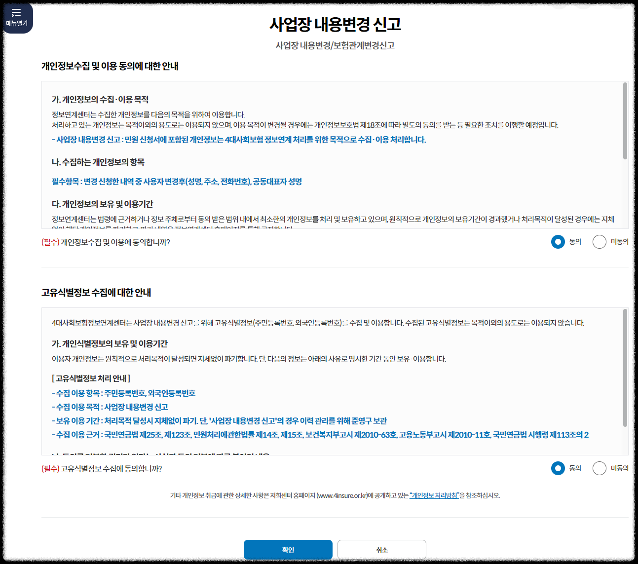 로그인 후 사업장 업무에서 "내용변경"을 선택합니다.