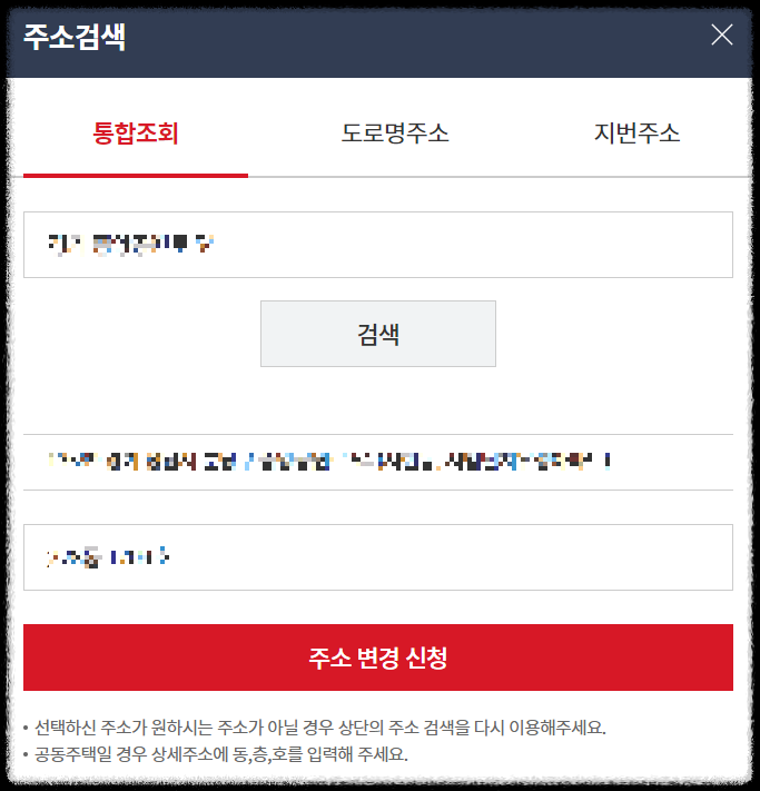 5. 이제 나머지 주소를 입력하고 "주소 변경 신청" 버튼을 누릅니다.