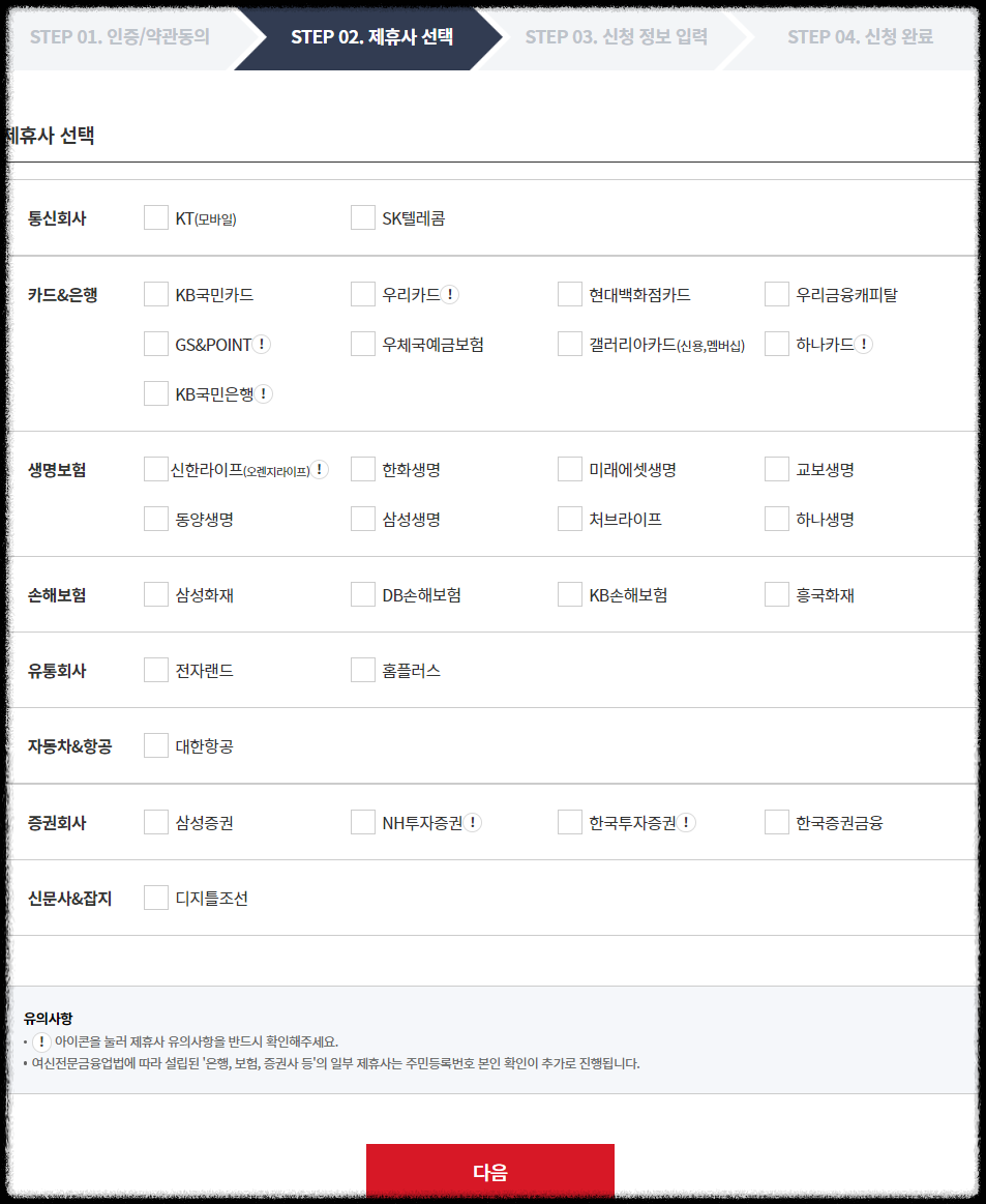 7. 인증을 하고 나면 변경할 제휴사를 선택하는 화면으로 이동합니다. 제휴사 중 원하는 회사를 선택한 후 "다음" 버튼을 클릭합니다.