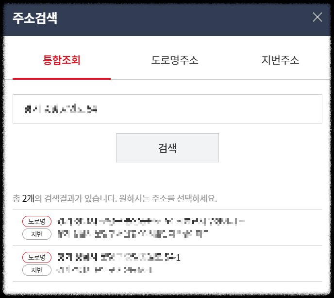 3. 나머지 주소는 직접 입력해야 합니다. 도로명주소나 지번주소 아무거나 검색을 한 후 해당 주소를 선택합니다.