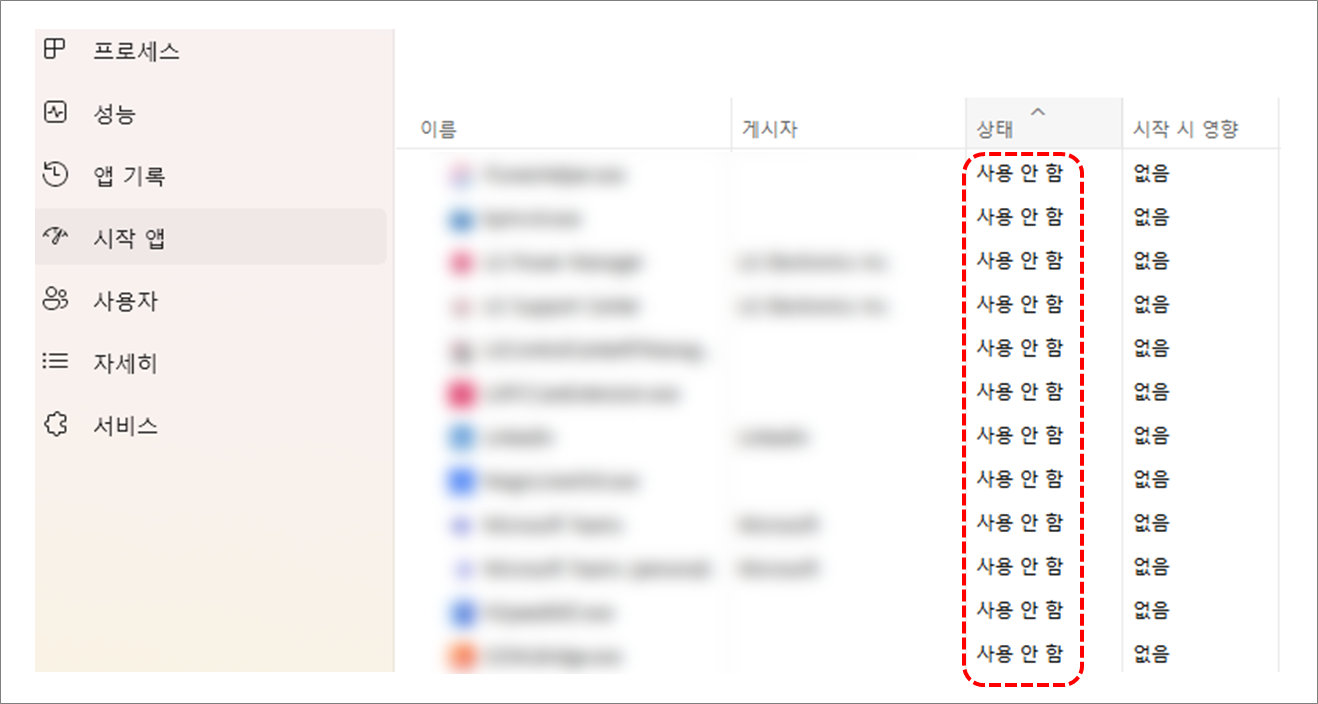 작업관리자 창에서 "시작 앱"을 선택하면 OS가 시작될 때 함께 시작되는 "앱(프로그램)" 목록 정보를 확인할 수 있습니다.
