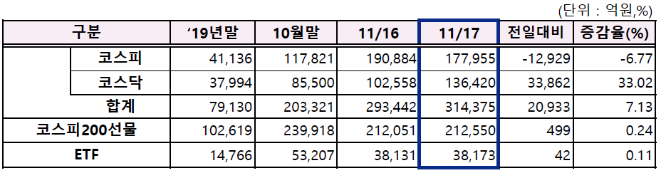 최근 0%대 초저금리로 인한 유동성 늘어나면서 주식시장으로 몰리는 돈이 기하급수적으로 증가하고 있습니다. 2020년 11월 금융투자협회 자본시장 주요동향 자료에 의하면 11월 17일 기준 증권사에 주식투자를 위해 대기 중인 투자자금이 63조 1,079억 원에 이릅니다. 이는 2019년 말 27조 3,933억 원에 비해 2배 이상 증가한 금액입니다.