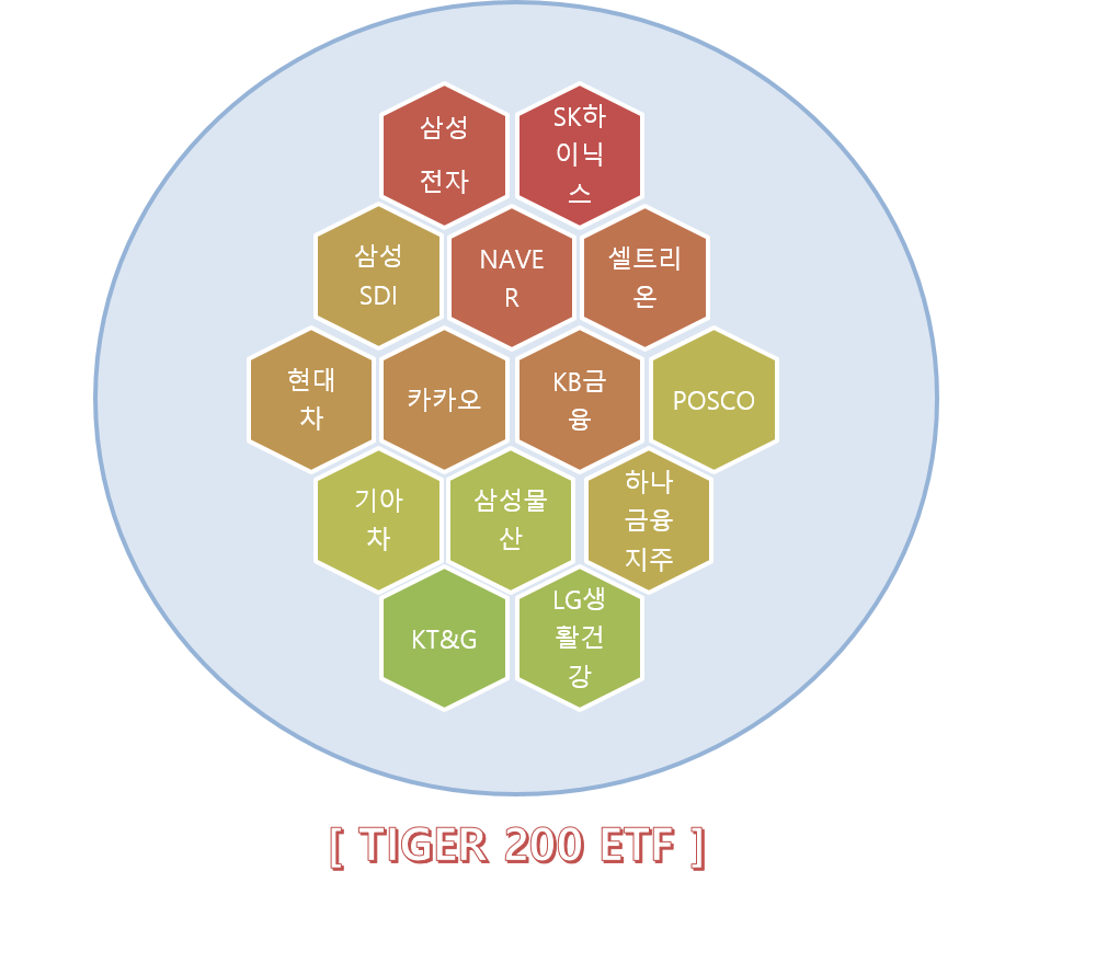 위 그림처럼 TIGER 200 ETF라는 바구니에 여러 개의 주식을 담아놓고 바구니를 쉽게 샀다 팔았다 할 수 있는 것입니다. ETF라는 바구니 안에는 특정 종목들이 모여 있어서 ETF의 가격은 특정 종목들의 지수를 추종하게 되는 것입니다.