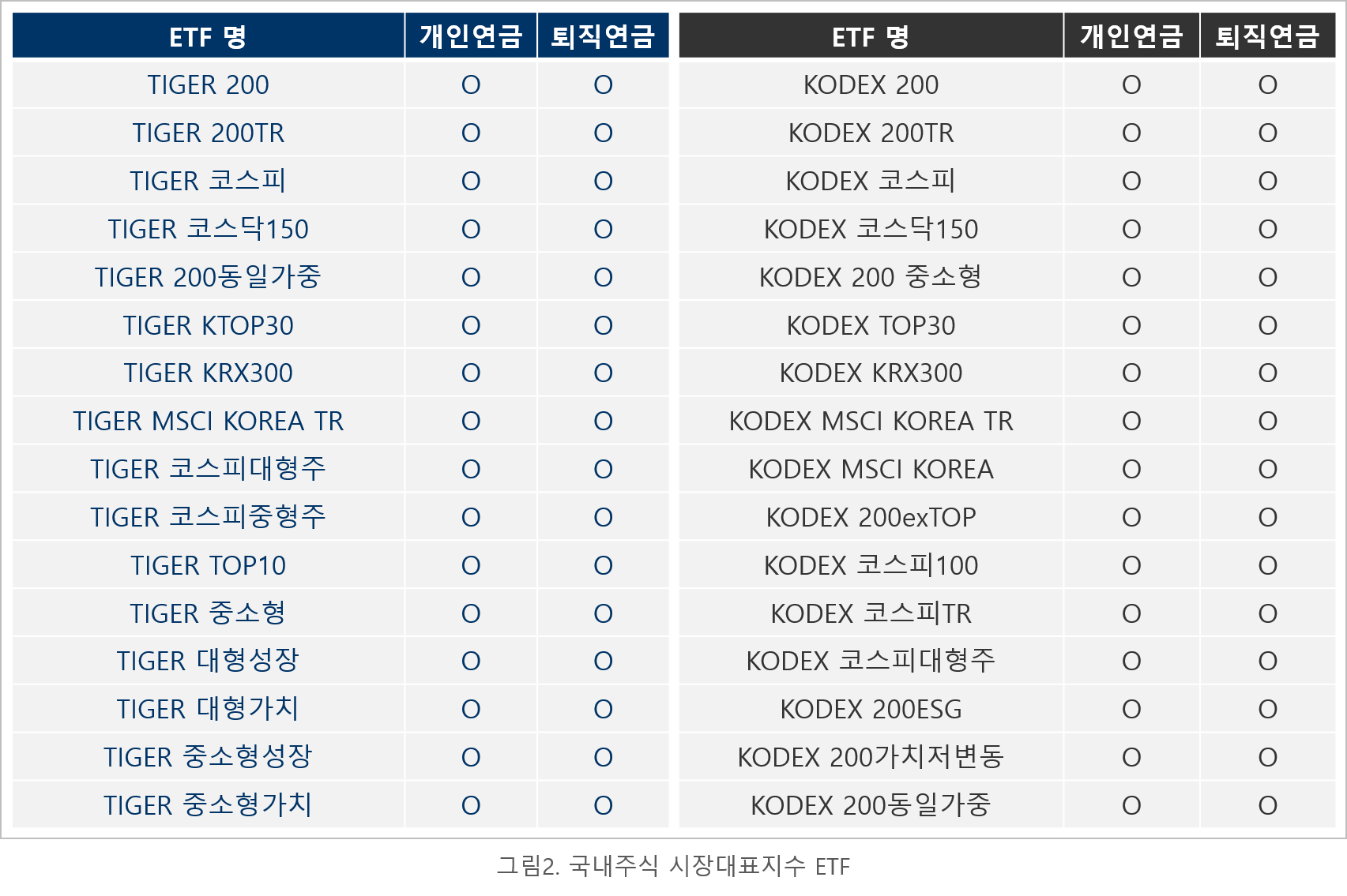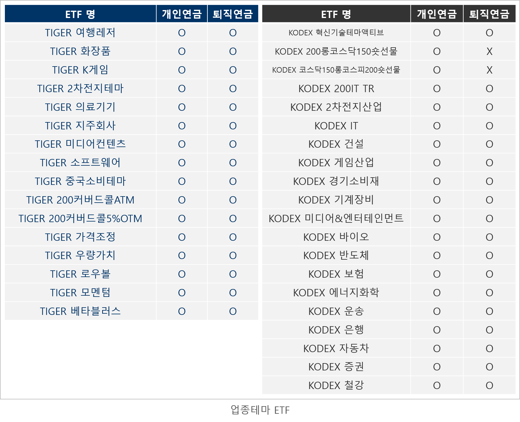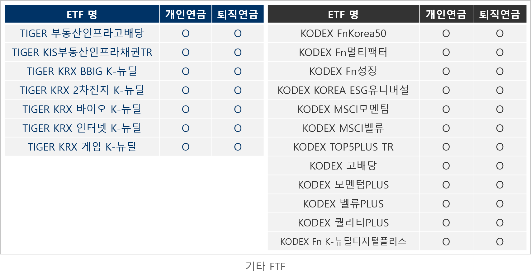 그럼. 오늘은 연금계좌에서 매매 가능한 ETF 중 삼성증권의 KODEX ETF와 미래에셋대우의 TIGER ETF에 대해서 정리해 보겠습니다.